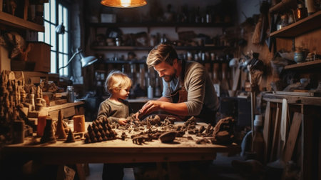 Generative AI : Smiling little boy learning to cut wooden plank with saw with help of father while spending time together in joinery workshop
