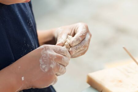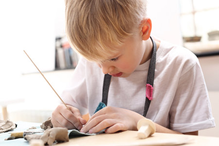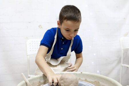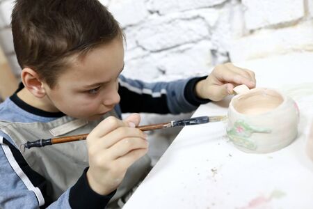 Ceramics for children. The boy is clawing out of a plastic workshop.