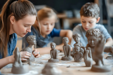 Mother and children sculpting small human clay figures on a table during a pottery workshop