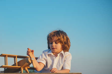 Child pilot with toy airplane dreams of traveling in summer in nature. Kids dreams. Child plays with a toy plane and dreams of becoming a pilot.