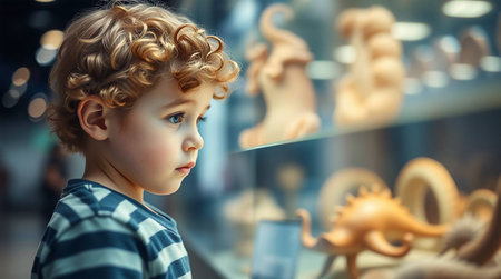 Portrait of a boy in a blue striped shirt looking at the exhibits in the museum