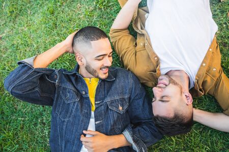 Portrait of young gay couple spending lovely time and laying down on the grass at the park. Lgbt and love concept.
