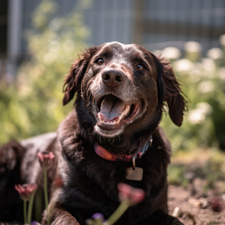 Portrait of a cute dog in the garden. Selective focus.