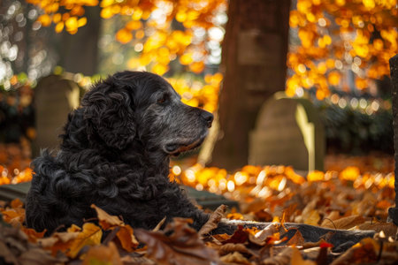 A black dog sits calmly on lush green grass in a park during a sunny afternoon. The golden sunlight filters through the trees, creating a serene ambiance.