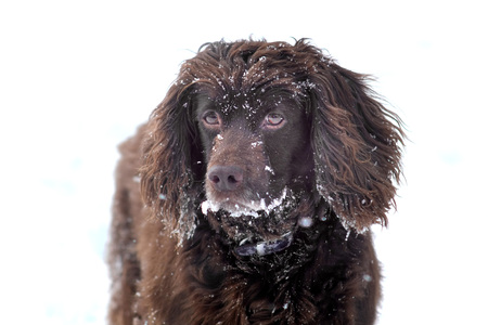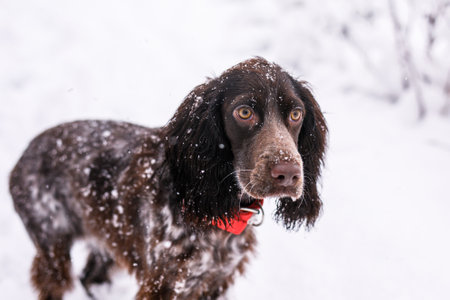 Russian spaniel dog walking outside in winter, playing with me, coming into snowdrifts. The benefits of active walks for hunting dogs.