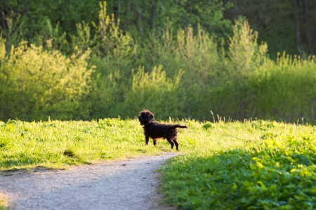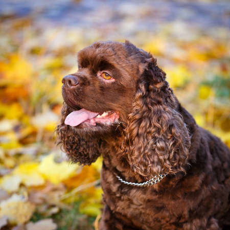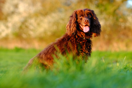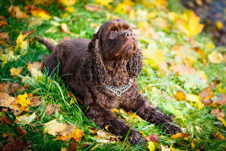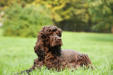 Beautiful water spaniel dog in park.