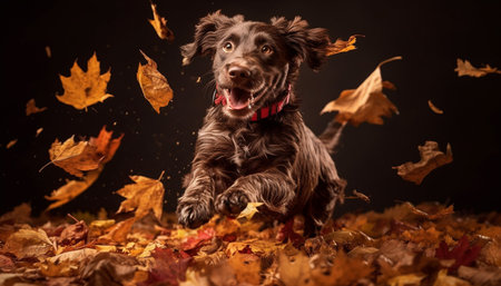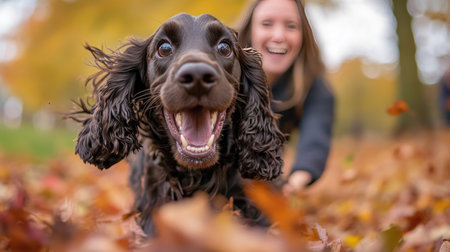 A joyful Cocker Spaniel running ahead of its owner in a park covered in autumn leaves, the woman smiling in the background.