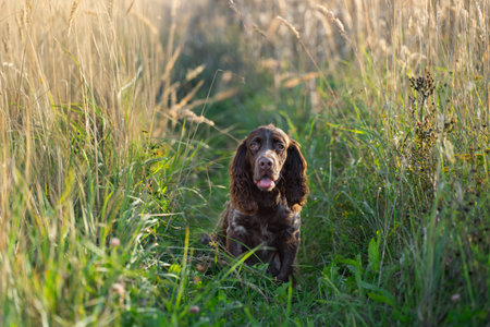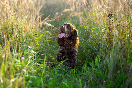 a dog on a walk in the field, a brown spaniel