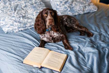 A brown spaniel lies on the bed with a book and yawns.