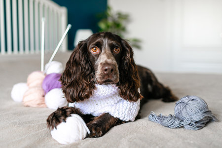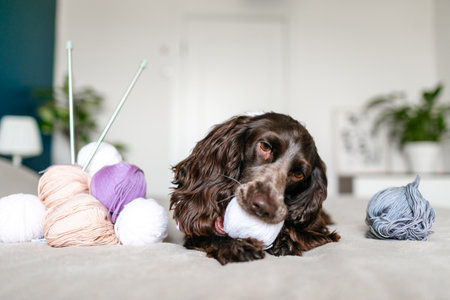 Dog Russian brown spaniel lying on the bed and playing with balls of colorful woolen threads