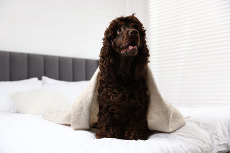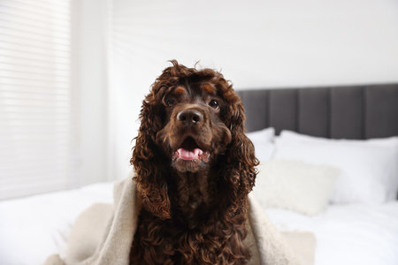 Cute Cocker Spaniel dog wrapped in blanket on bed at home