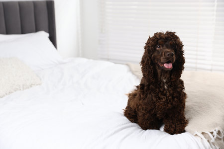 Cute spaniel on bed indoors
