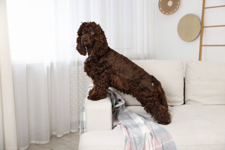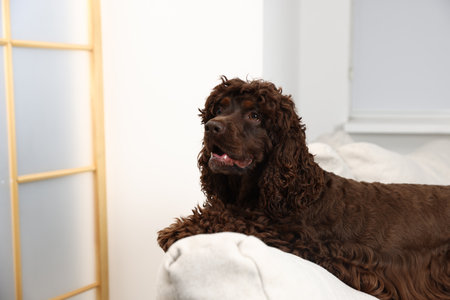 Cute Cocker Spaniel dog on sofa at home, space for text
