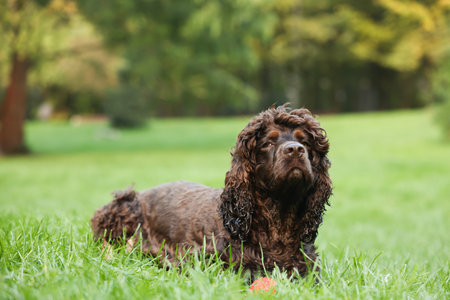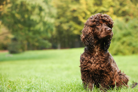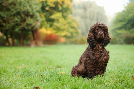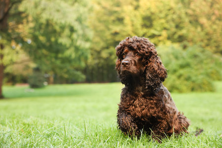 Beautiful water spaniel dog in park. Space for text