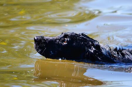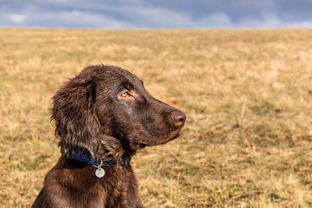 Retriever puppy head. Brown flat coated retriever puppy. Dog's eyes. Hunting dog in the meadow.