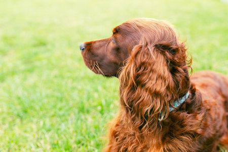 Beautiful happy Irish Setter dog is lying in grass on a beautiful summer day. Copy space