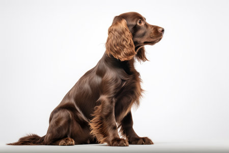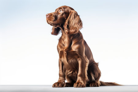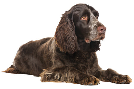 Smart English Cocker Spaniel dog sitting and following commands against white background Domestic an