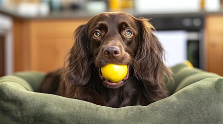 black cocker spaniel holding blue ball on sofa, playful posture and alert eyes, toy interaction, energetic indoor mood,
