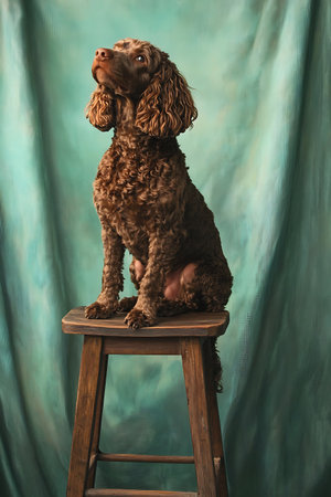 A brown, curly-haired dog sits on a wooden stool in front of a teal green background.