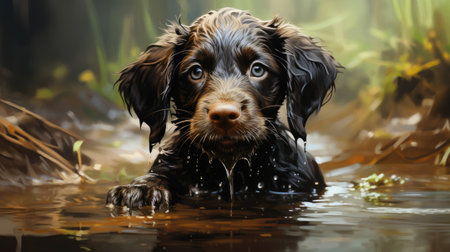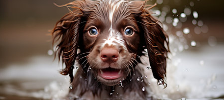 A playful puppy delights in splashing water during a sunny day, showcasing its excitement and energy. Its fur is wet, and droplets sparkle around as it plays joyfully.