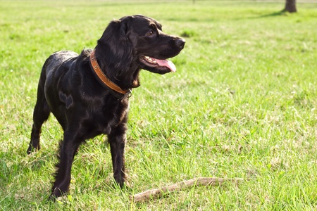 Black Dog Spaniel on a green grass lawn