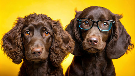Two brown dogs, one wearing glasses, looking at the camera against a bright yellow background.