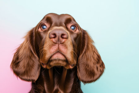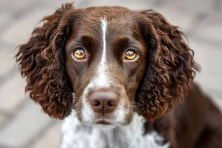 Close up of a springer spaniel dog staring intensely with amber eyes, showcasing its brown and white fur