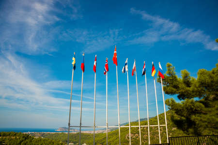 Alanya peninsula, Antalya district, Turkey, Asia: Landscape view from above and from afar to the city and flags of different countries