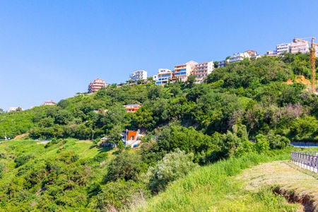 Residential buildings on the green hill under blue sky in Montenegro.