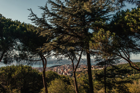 Panarama of Manavgat city, Turkey at sunset. View from the observation deck through the pine trees