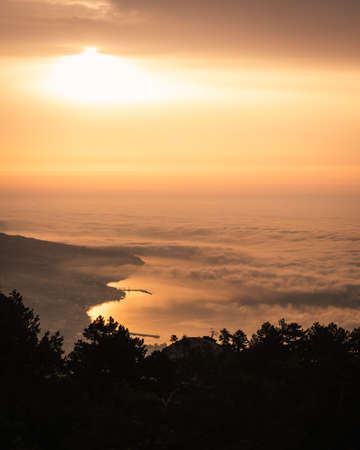 Beautiful sunrise with clouds above the sea. View from the mountain on the town. Peaceful scenery, inspiring nature. Silhouette of the forest.