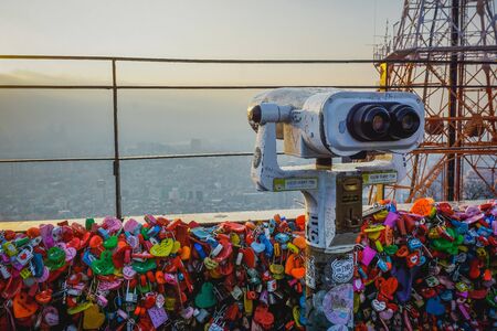 Seoul, South Korea - December 16, 2018: Binoculars on the viewpoint in Namsan Park, among thousands of locks of love, and view of the whole city