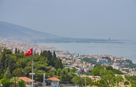 Panoramic photo of Izmir city from Kadifekale hill with a Turkish flag