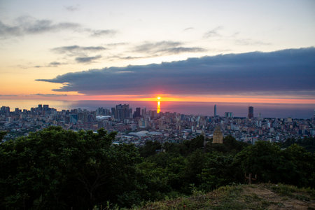 Sunset in Batumi. Dramatic sunset over the Black Sea. Beautiful view of the evening city and sea. Sunset in seaside town.