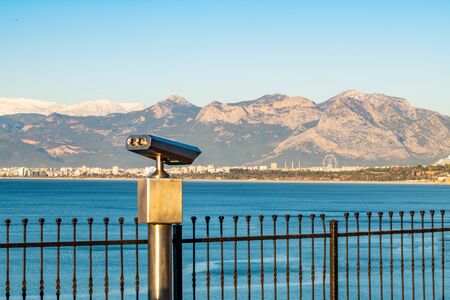 Closeup view of coin operated binocular viewer for looking in details at beautiful summer cityscape landscape. Antalya, Turkey. Happy summer holidays and sightseeing concept. Horizontal photography.