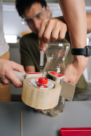Two young student preparing liquid fertilizer in plastic bottle, using syringe and tape dispenser for science experiment in laboratory. Concept of sustainable innovative approach to indoor gardening.