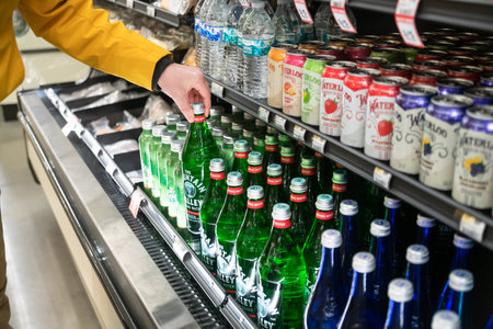 Mineral sparkling and pure water on the supermarket counter. Assortment of different brands.