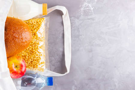 Food donations in linen bag. Food delivery in eco bag. Eco bag with food supplies food stock. Top view. Copy space