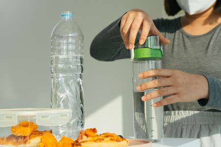 Lot of plastic packaging of fresh water,people wearing face mask,choosing fresh water,beverage and food,woman panic buying and hoarding during the Covid-19,Coronavirus epidemic,preparing for pandemic