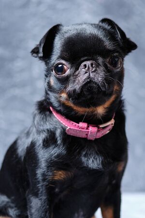 A purebred Brussels griffon against a gray wall after trimming in the animal salon