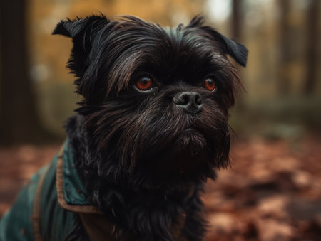 Portrait of a black small wire-haired dog of the Belgian Griffon breed outdoors in the forest on a background of nature in blur in autumn