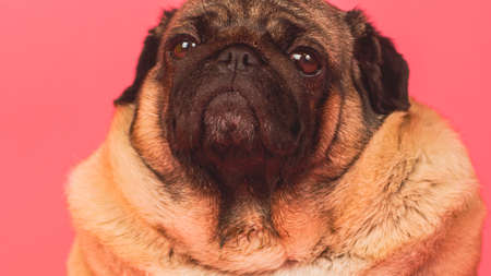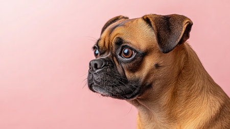 A pug mix dog with expressive eyes gazes thoughtfully at something off-camera against a pastel pink backdrop.