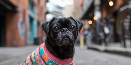 Pug wearing colorful sweater sits on street in urban setting during daytime