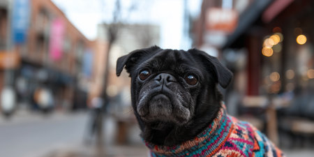 Pug in a colorful sweater sits on a city street near cafes and shops in winter
