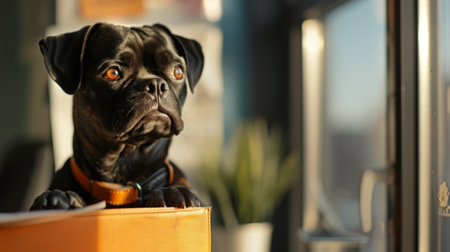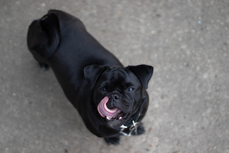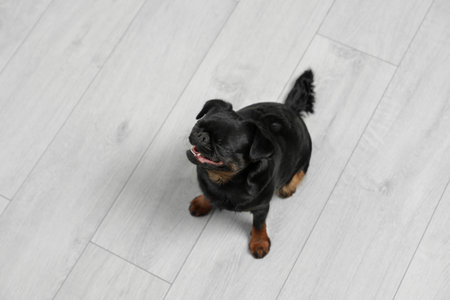 Adorable black Petit Brabancon dog sitting on wooden floor, above view