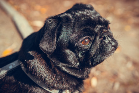 Portrait of cute pug puppy, outdoors. Healthy and active pet