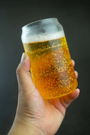 Hand holding up a glass of cold beer on black background