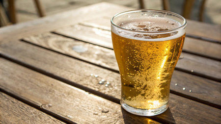 Fresh cold beer in glass on table with copy space for text. holiday vacation with alcohol drinking in summer.