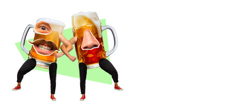 Contemporary art collage. Modern creative artwork. Two happy, smiling huge mug of beer with noses, lips, mustache and eye having fun together. concept of festival, traditions, drinks and holidays.