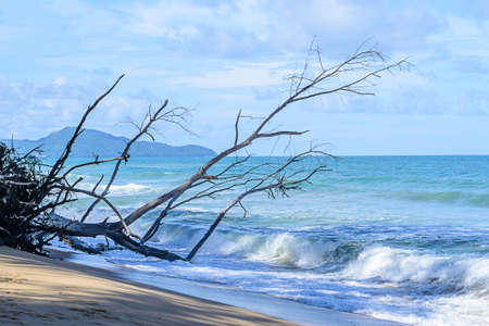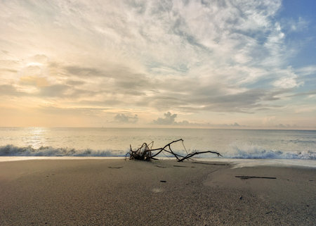 Tropical beach at sunset with dry tree trunks in the foreground